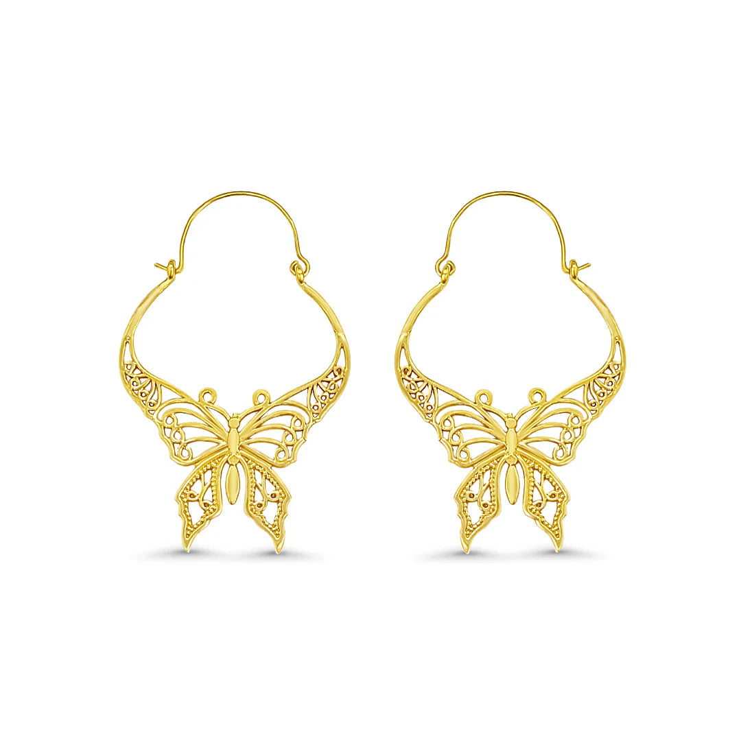 Inspired by the delicate grace of butterflies, these gold-plated hoop earrings feature an intricate filigree design that combines elegance with a touch of whimsy. The delicate butterfly motif adds a unique, refined charm, making them a captivating addition to any outfit.