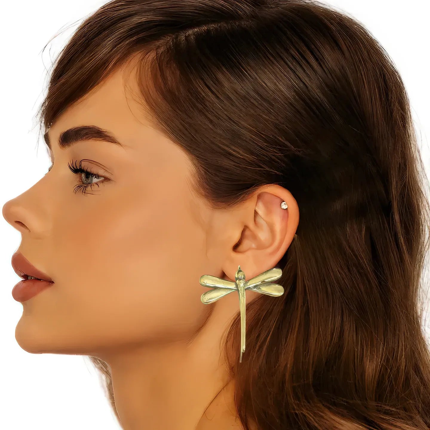 A sleek, nature-inspired design that adds movement and shine to your look. These earrings feature a sculpted dragonfly silhouette with smooth wings and a long, elegant tail, creating a standout piece that feels both bold and refined.