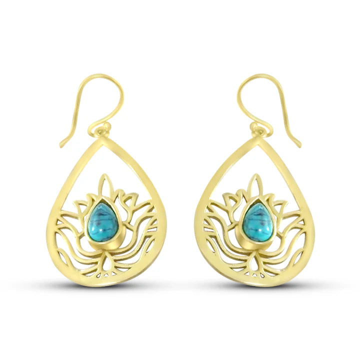 Elevate your style with these enchanting earrings, inspired by the tranquil beauty of lotus flowers. The striking turquoise droplets are set within an artful gold-plated design that captures the essence of serenity and sophistication.