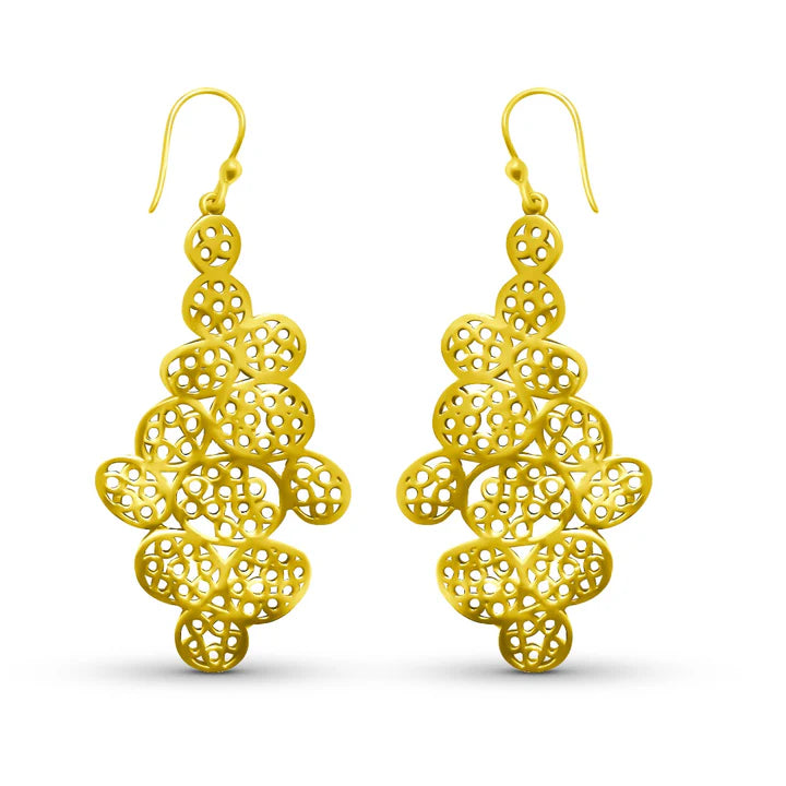 Gold filigree leaf drop earrings with intricate cutout design, lightweight statement style.