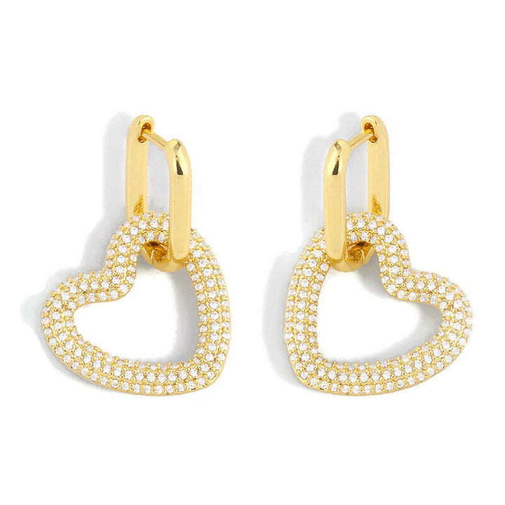 These heart drop-dangle earrings have a charm that blends romantic elegance with a touch of sparkle. The delicate heart design, adorned with glittering stones, adds a refined yet playful twist, making them the cutest accessory for any occasion.