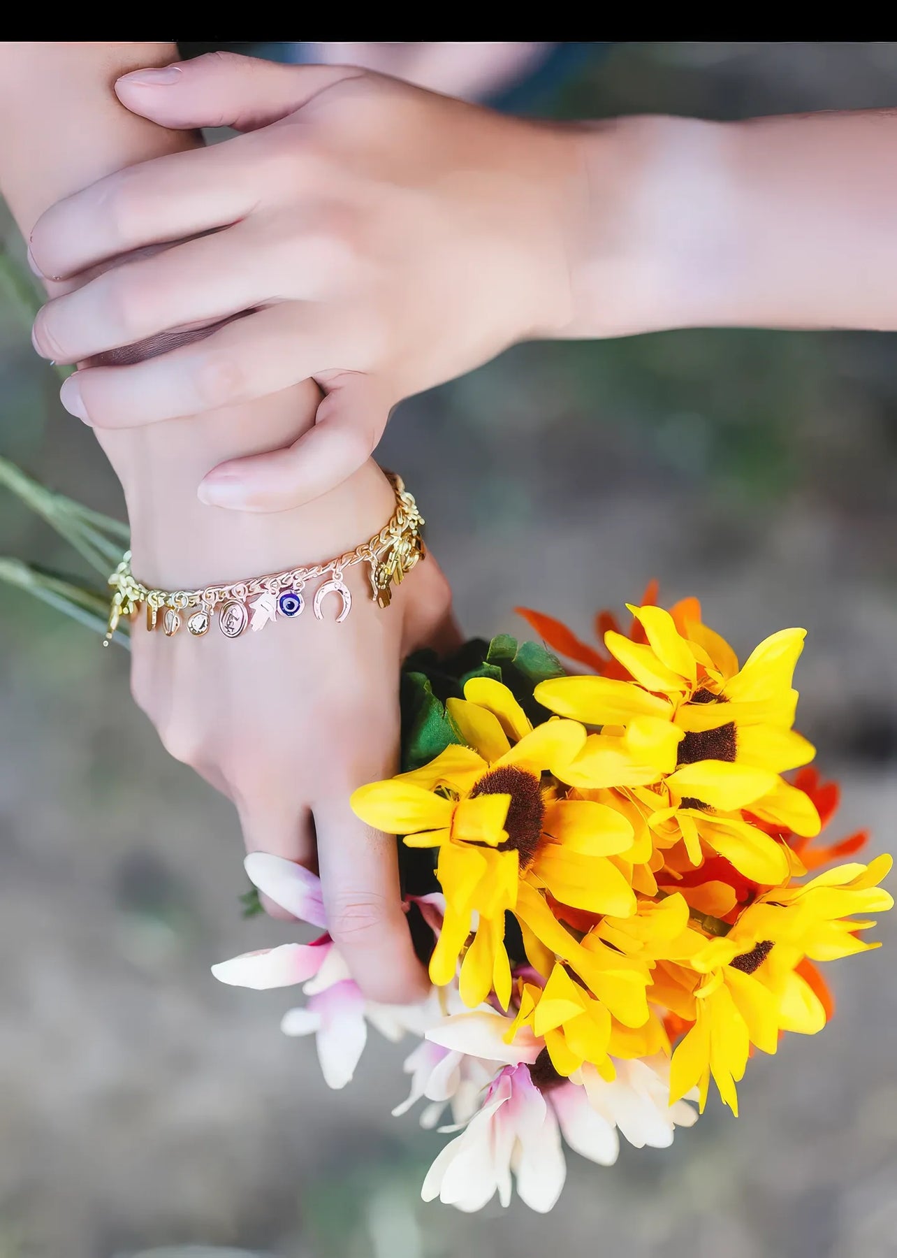 - Multiple charms including evil eye, elephant, hearts, Italian horn, and butterfly