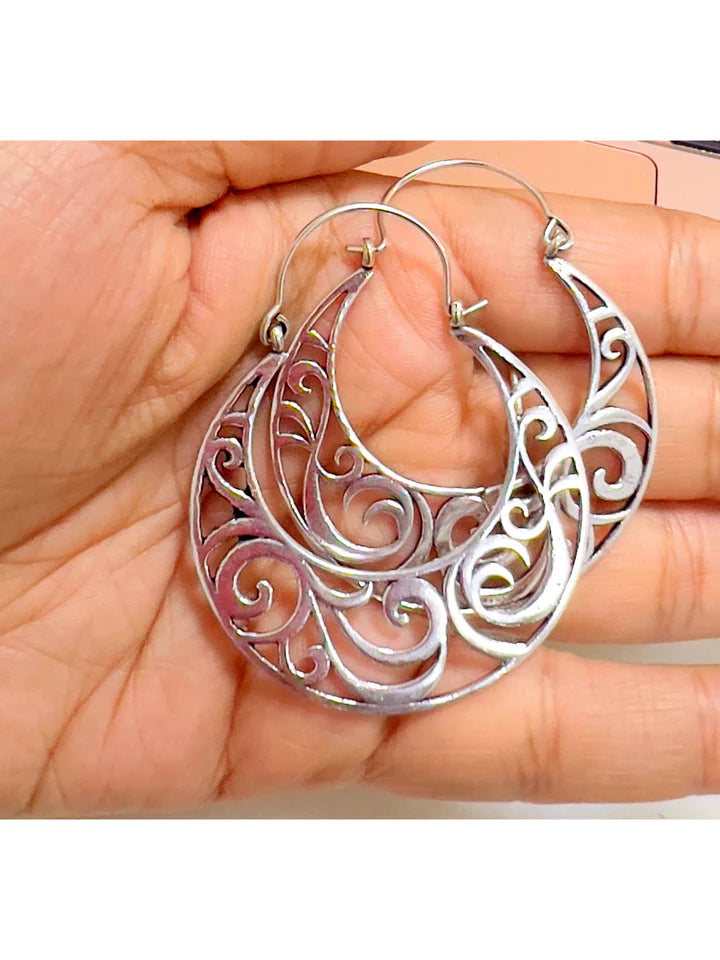 Inspired by the timeless vintage elegance, these hoop earrings feature a mesmerizing curvy design that beautifully captures the essence of bohemian style. Crafted with a lustrous gold metal finish, the delicate detailing adds a sophisticated touch, making them a perfect statement piece for any occasion.